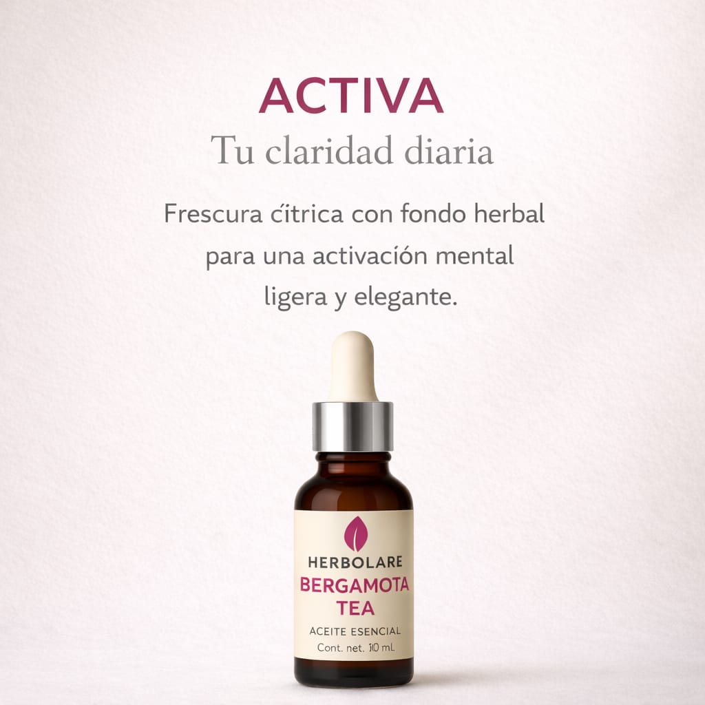 Bergamota Tea de Herbolare es una sinergia artesanal de bergamota, menta arvensis, limón y pachuli que eleva el ánimo, mejora la concentración y crea ambientes de conexión profunda. Su aroma cítrico-mentolado con matices dulces estimula la energía vital, la claridad mental y favorece la apertura emocional. Aceites esenciales 100% puros. Sin fragancias sintéticas. Con más de 23 años de experiencia en aromaterapia auténtica.